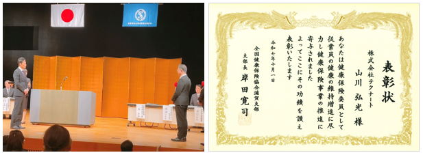 「令和7年度 滋賀県社会保険委員大会」内にて年金委員・健康保険委員表彰式があり、当社 取締役 山川 弘光が全国健康保険協会支部長表彰を受けました。