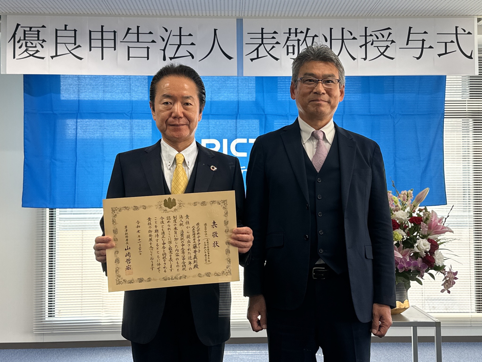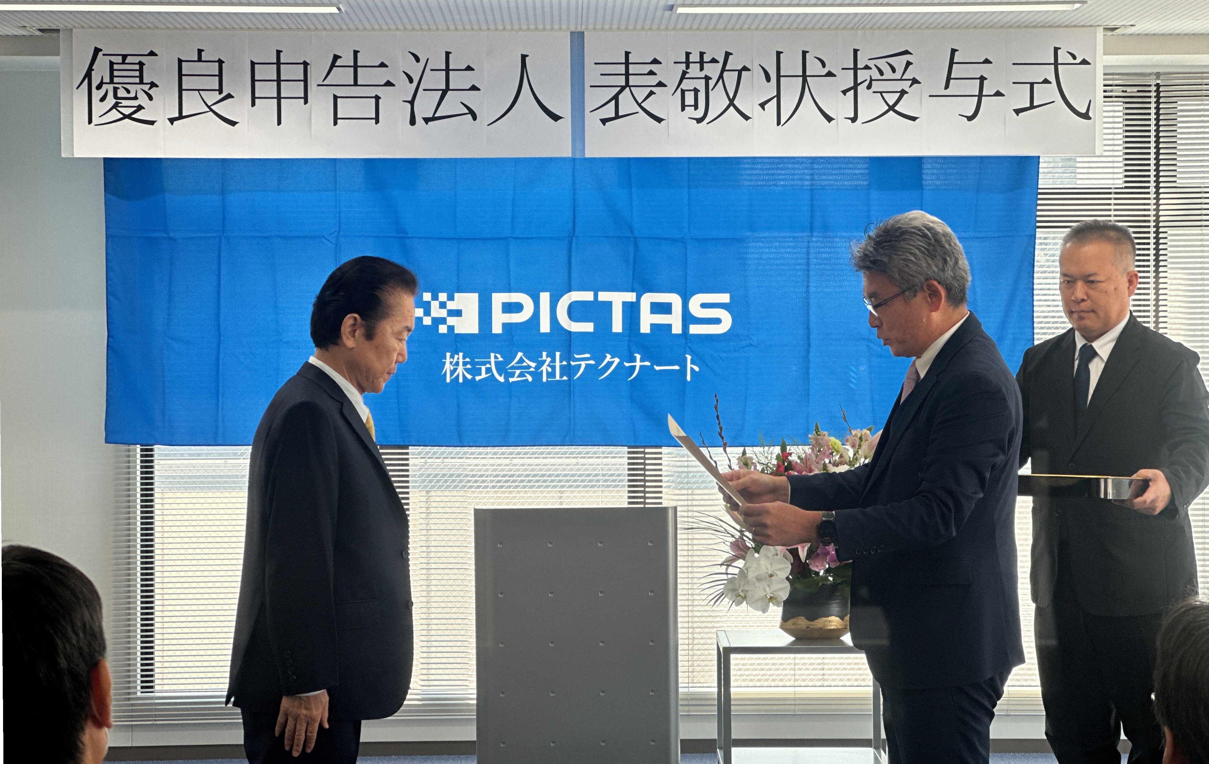 株式会社テクナートは、令和7年11月21日に本社ビル5階ピクタスホールにて草津税務署 山崎署長様より「優良申告法人」として表敬状を拝受しました。